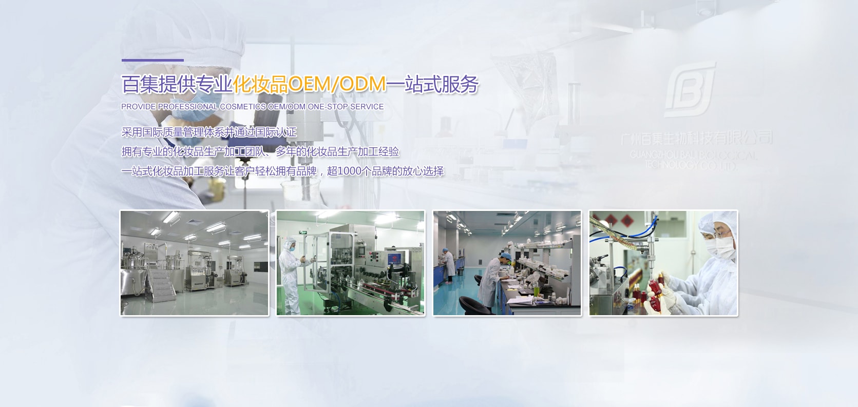 百集生物擁有16位專業工程師,79多位研發人員,6000多款成熟配方 百集生物研發中心占地3000多平方米,擁有成熟的研發團隊及完善的研發設施,使用納米技術、滲透壓技術、 液晶微乳化技術等,已經擁有一系列穩定性高、滲透性強、吸收性好、效果顯著的成熟配方。